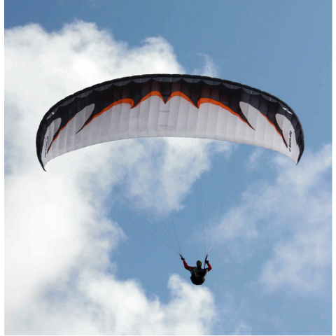 ボディーガード2 は基本設計の段階で巡航速度を抑えて強い揚力と穏やかなハンドリングを追求しているので、非常にゆっくりとしたスピードで滑空をおこなうことが可能です。また、細かい操作を行わなくてもブレークコードを緩めて機体の動きに任せると勝手に安定してくれるというとても安心な特徴を持っています。例え乱気流に遭遇して、身体を揺らされるような状況にあっても、強くブレークコードを引き込まずにスムーズなボディーガード2